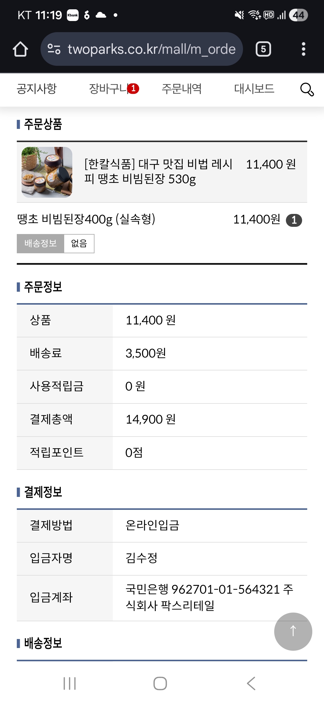 [답변] 입금을 배송비 별도로 하였습니다