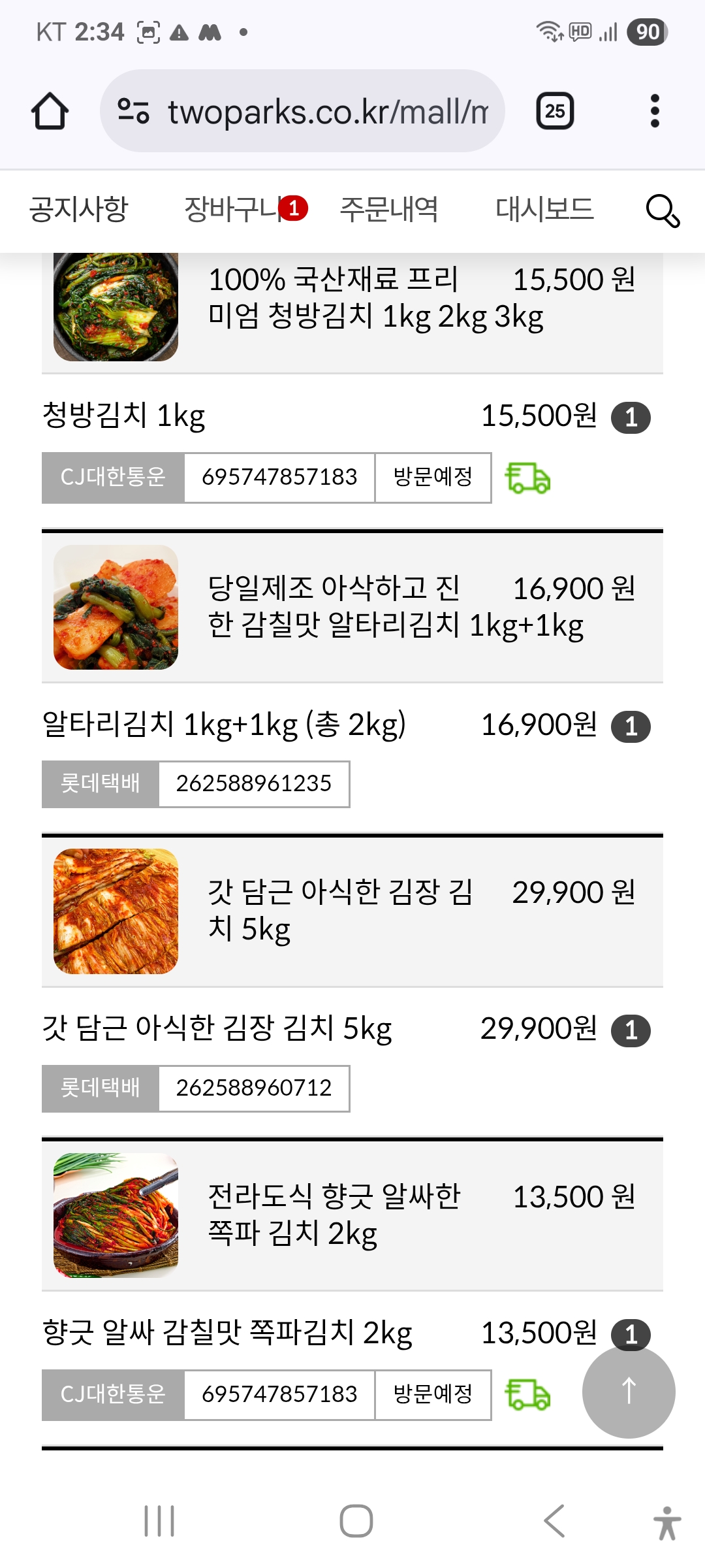 4가지 제품 을 주문했는데요 대한통운 송장번호가 상품은 두개주문햇는데 운송장번호는한가지로 두가지상품으로 표기됐음 청방김치와 쪽파김치 두가지 상품에 운송장번호가 한가지이니 결론적으로 쪽파 김치는 미발송건입니다 빨리발송해주시기 바랍니다