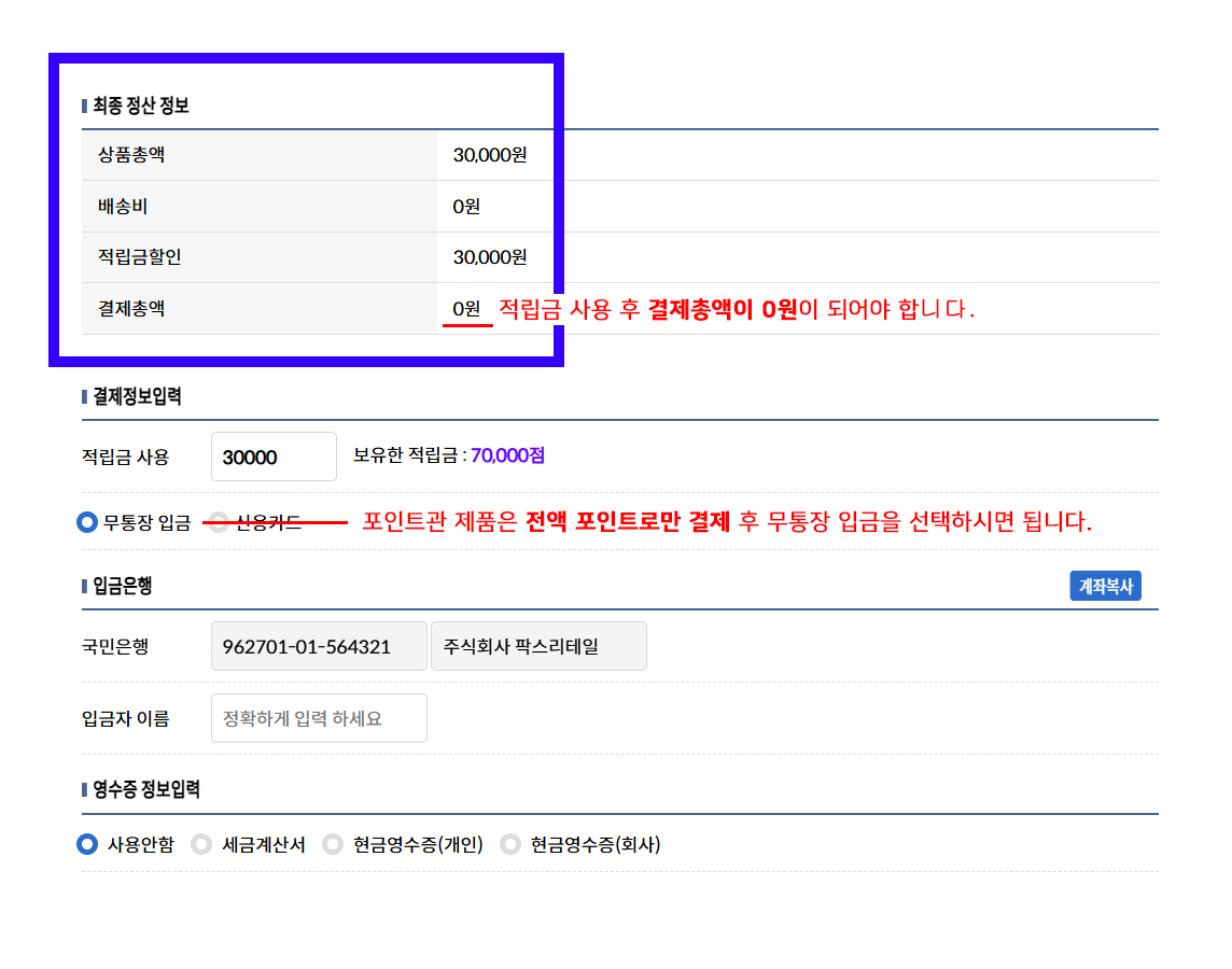 포인트관 모든 상품은 포인트로만 구매가 가능합니다. 결제 시 포인트일반구매(무통장입금, 카드결제)는 불가능합니다. ※결제 시 결제정보입력에서 사용하실 적립금 금액을 입력하시면 됩니다. ※최종정산정보에서 결제총액이 0원이 되어야 주문이 가능합니다. 첨부한 이미지를 참고하시기 바랍니다.
